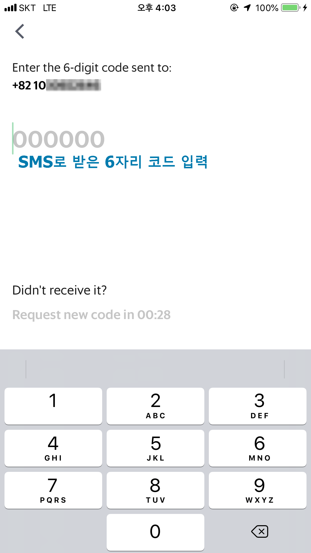 SMS로 받은 6자리 숫자 인증코드를 입력하자.