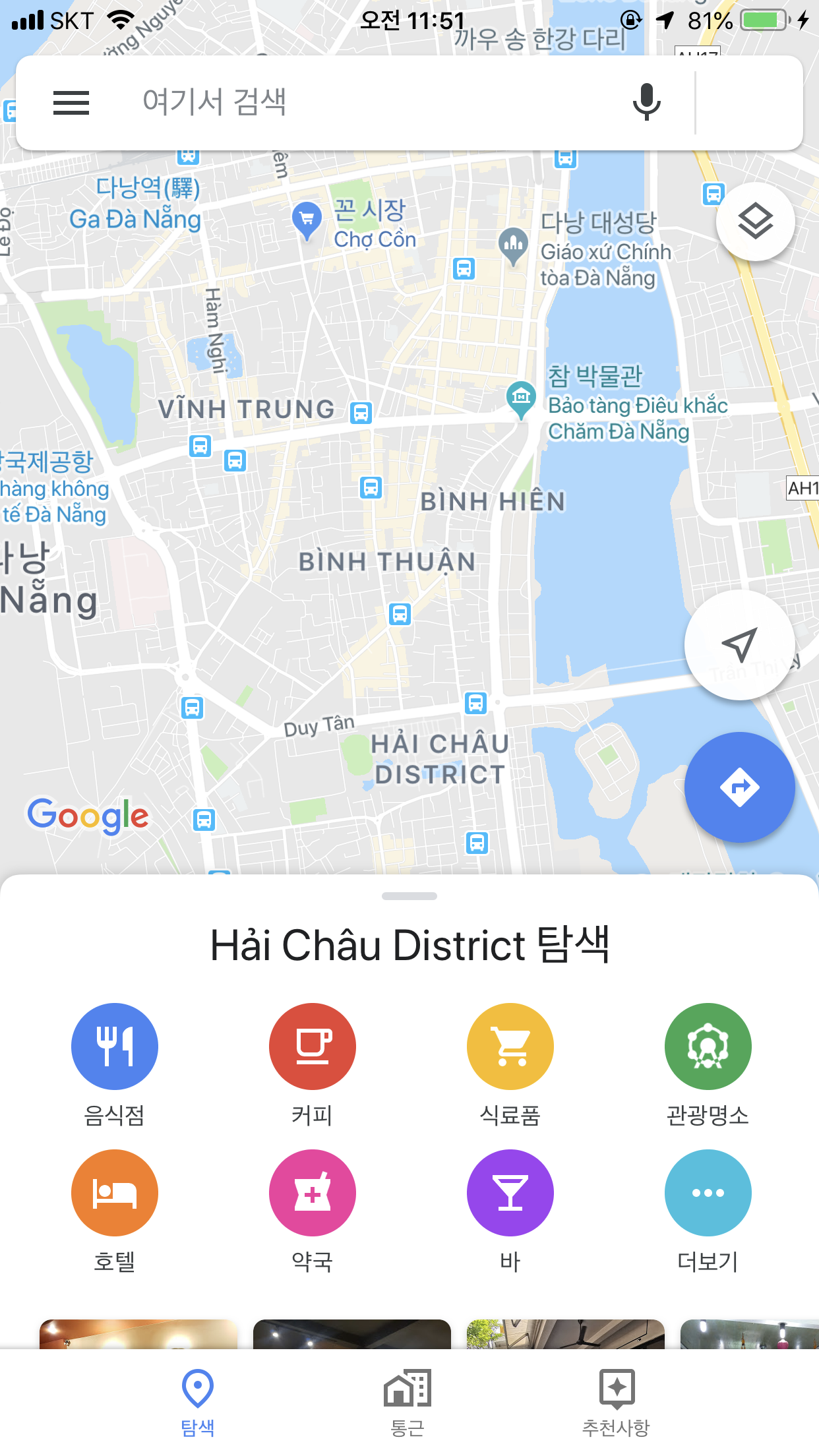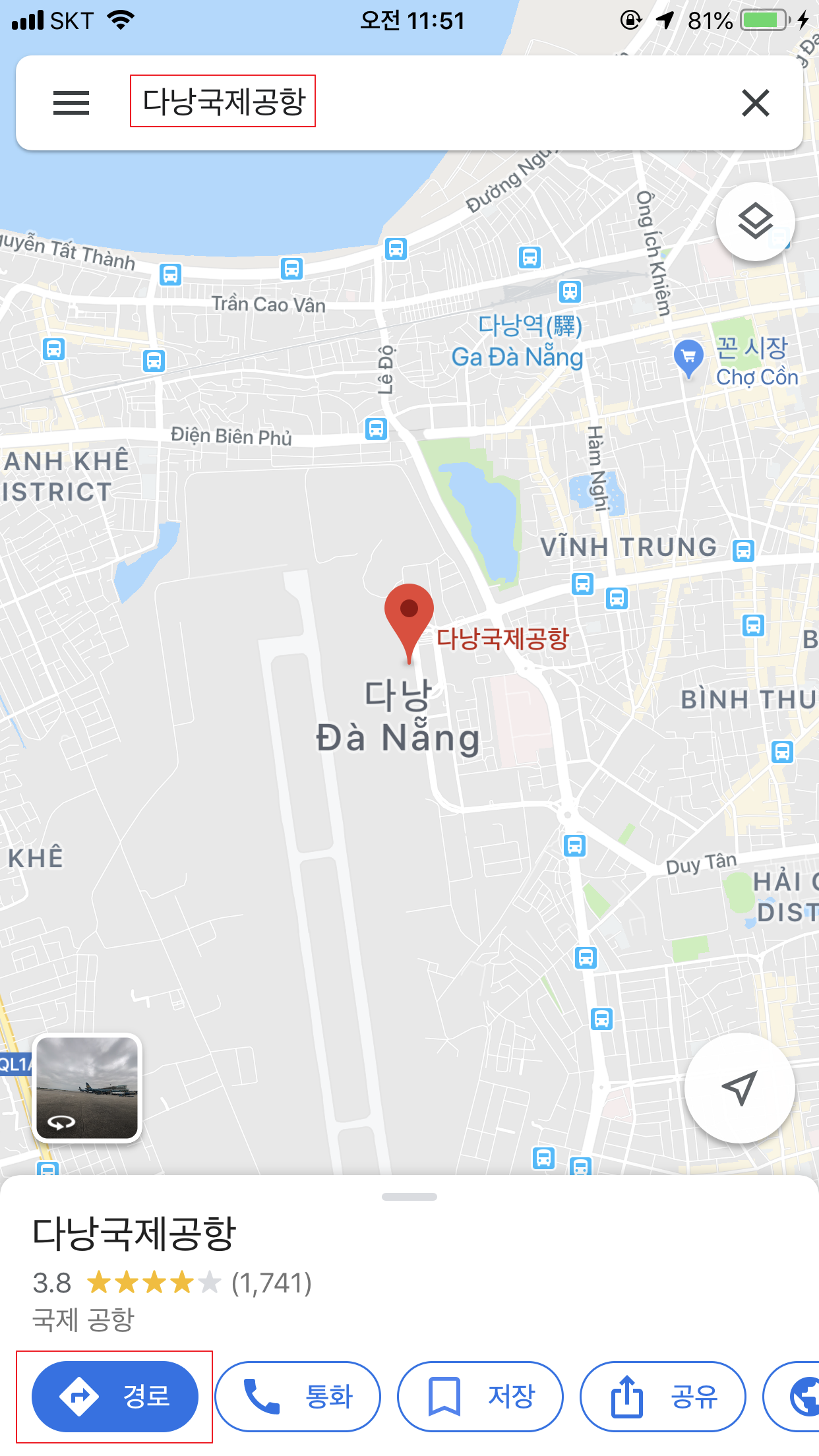 다낭공항을 검색 후 경로를 누르면 보통 현 위치에서 목적지까지 경로가 표시된다.