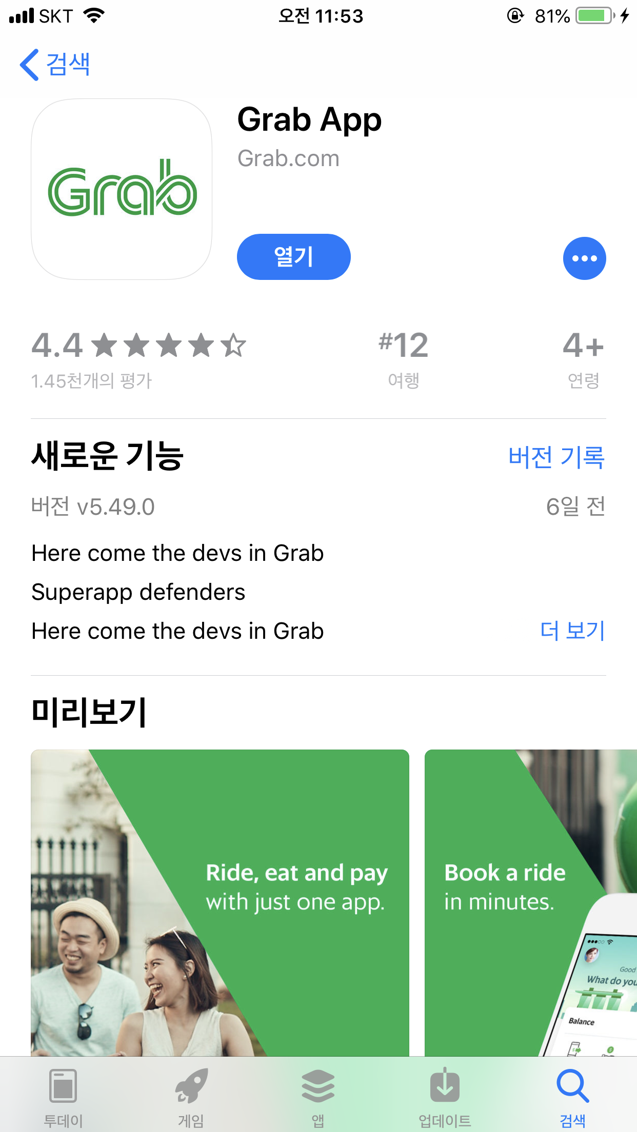 인원수에 맞게 선택 후 앱 열기를 누르면 그랩 어플이 실행되며 넘어간다.