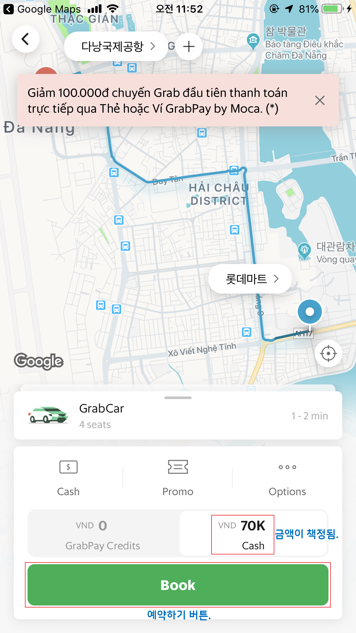 그랩 어플에서 금액을 확인하고 Book으로 예약하면 되는데 보통 신용카드 등록하지 않으면 현금으로 선택이 된다.