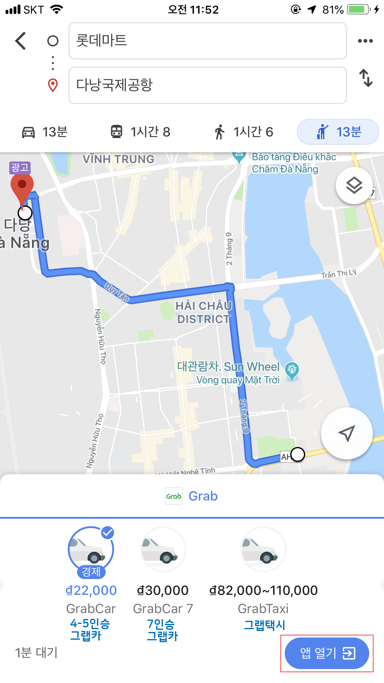 경로 검색 결과에서 제일 오른쪽에 표시한 짐들고 손을 들고있는 메뉴를 누르면 구글맵과 그랩이 연동되는 화면으로 넘어간다.