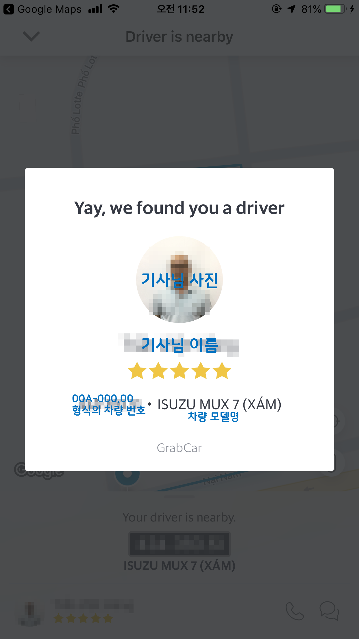 그리고 매칭이 되고 기사가 이동중에 그랩 앱을 통해 채팅을 거는 기사도 있는데 어차피 간단한 영어이니 대충 콩글리쉬로 대답해주면 되니 당황하지 말자.