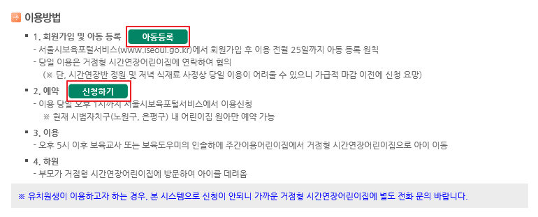 회원 가입 후 로그인을 한 뒤에 위에 있는 안내문대로 '메인페이지 > 보육서비스 예약 > 거점형시간연장보육'으로 이동하여 '아동등록'을 먼저 하고 '신청하기'로 예약하면 된다.