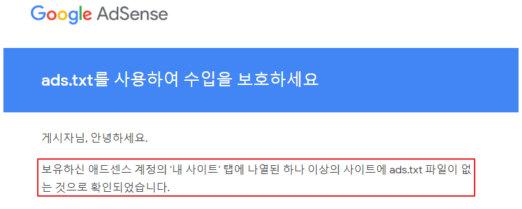 그런데 최근 구글 애드센스 알림으로 "[조치필요] ads.txt를 사용하여 수입을 보호하세요"라는 제목으로 메세지가 와 있었다..