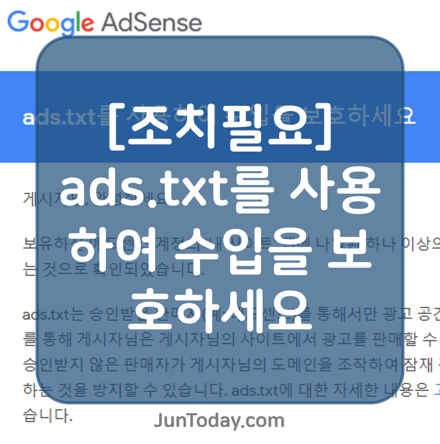 나는 개인 도메인인 juntoday.com과 티스토리를 연결해서 사용했는데 그 전까지는 아무런 문제가 없었다. 그러던 중 구글 애드센스에서 갑자기 ads.txt를 찾을 수 없다는 경고창이 떴다. 찬찬히 읽어보니 juntod..