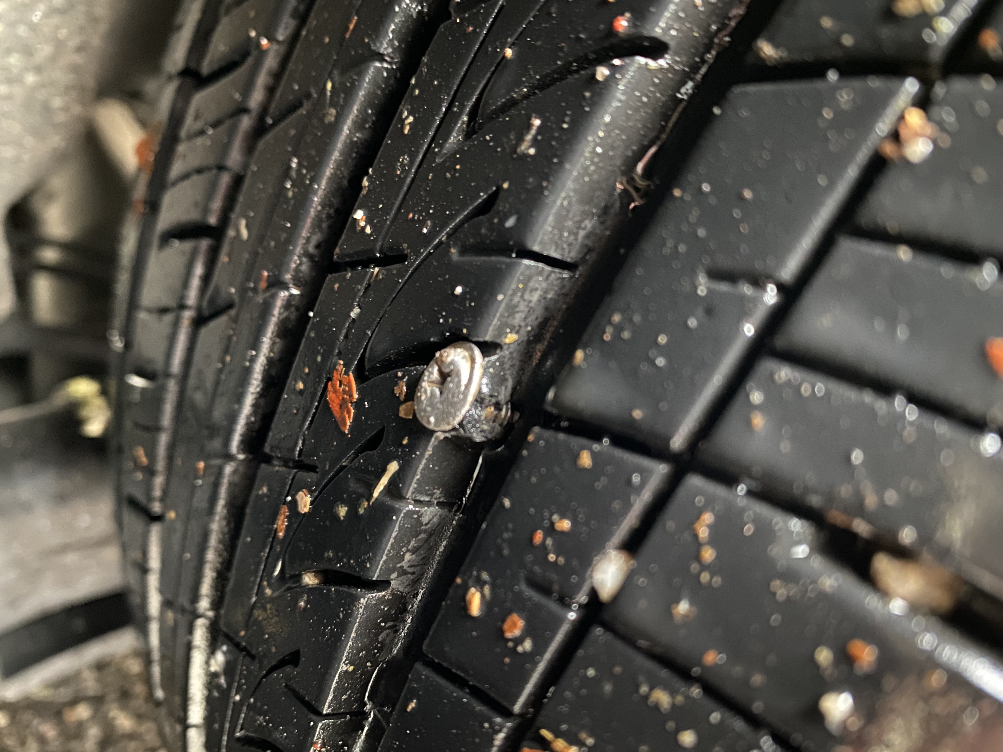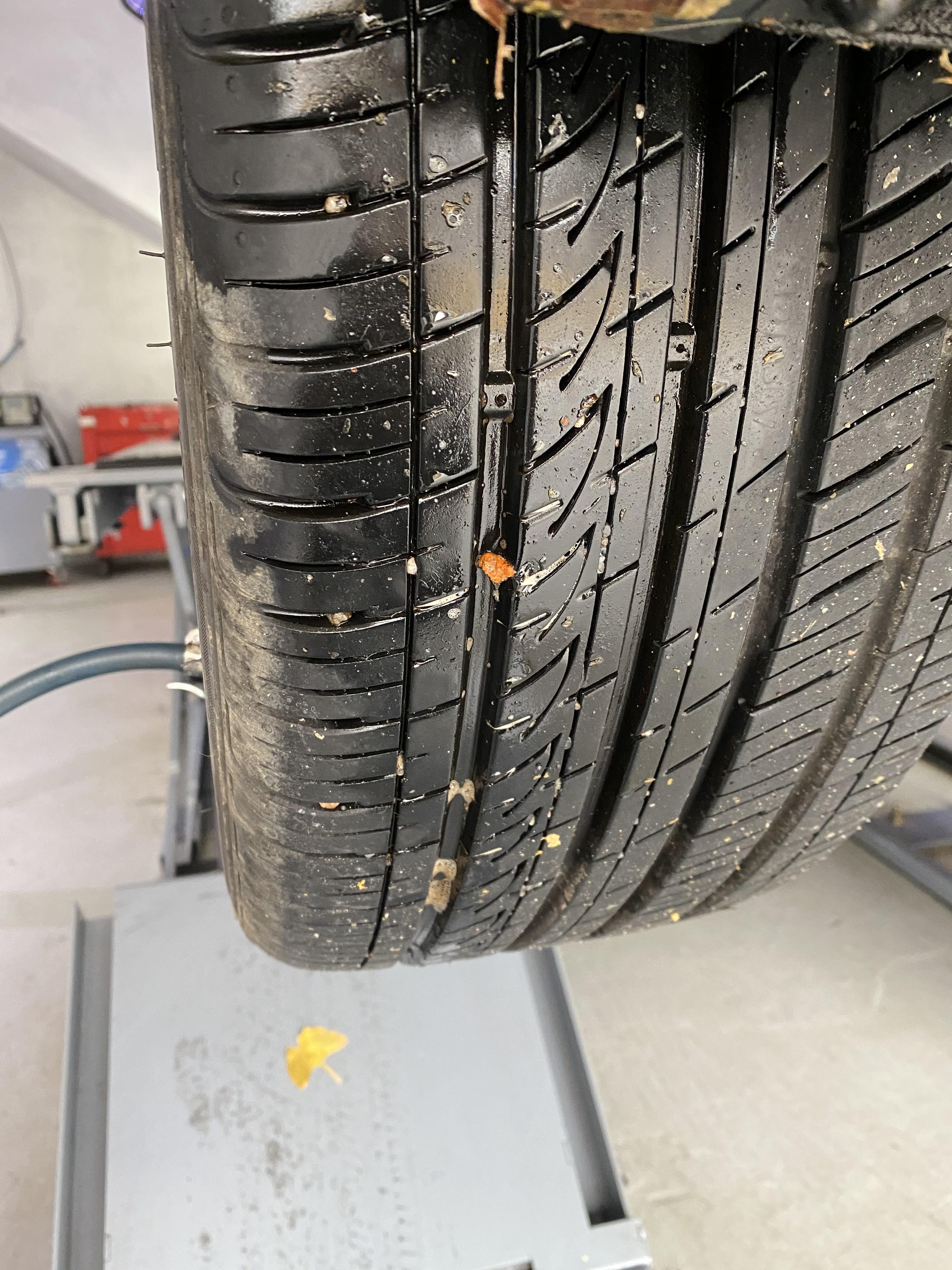 내려서 타이어를 보니 나사못이 박혀있다.