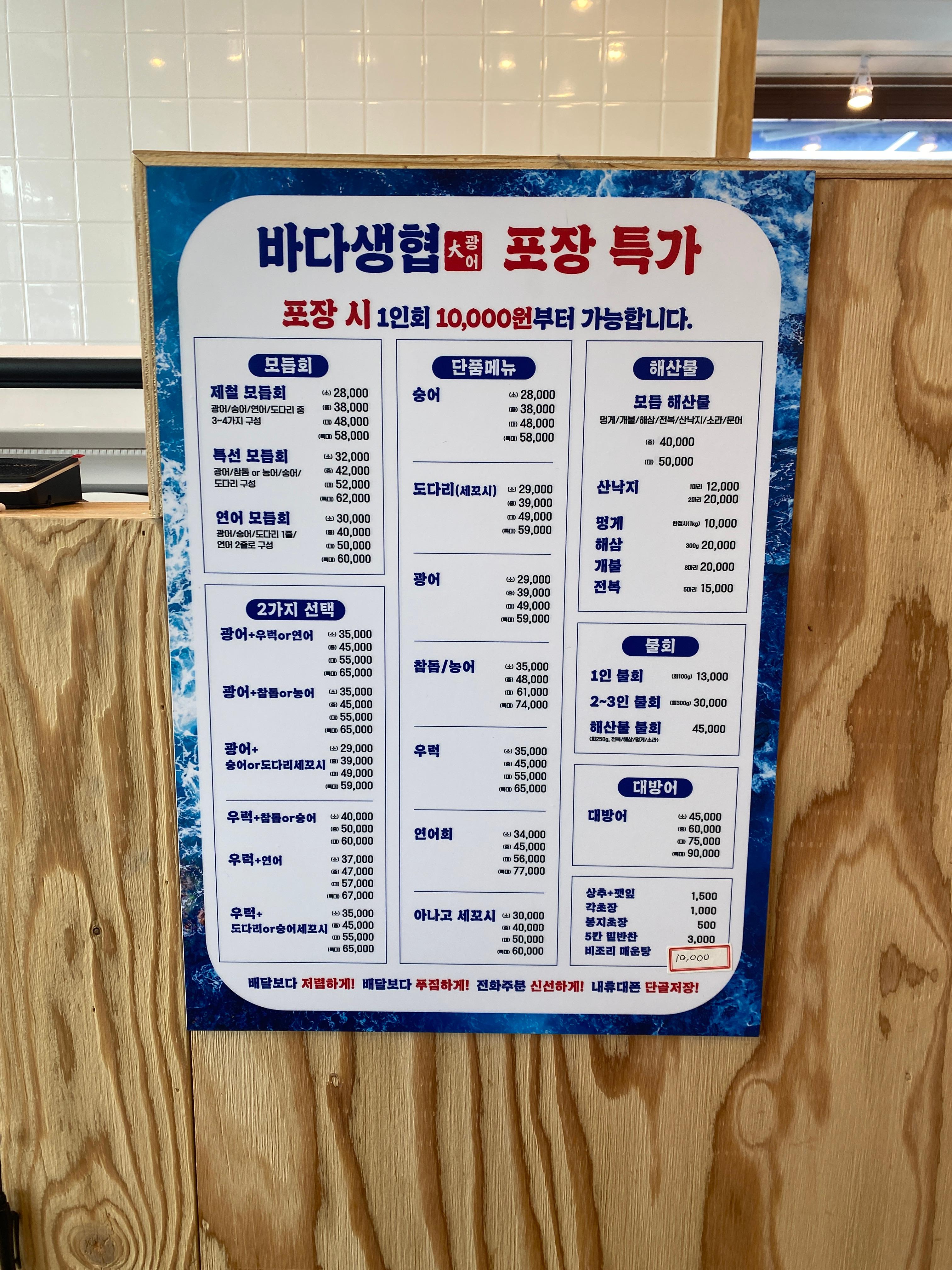 특선모듬회 특대로 포장하고 매운탕거리도 추가 했는데 매운탕거리는 별도 만원임.